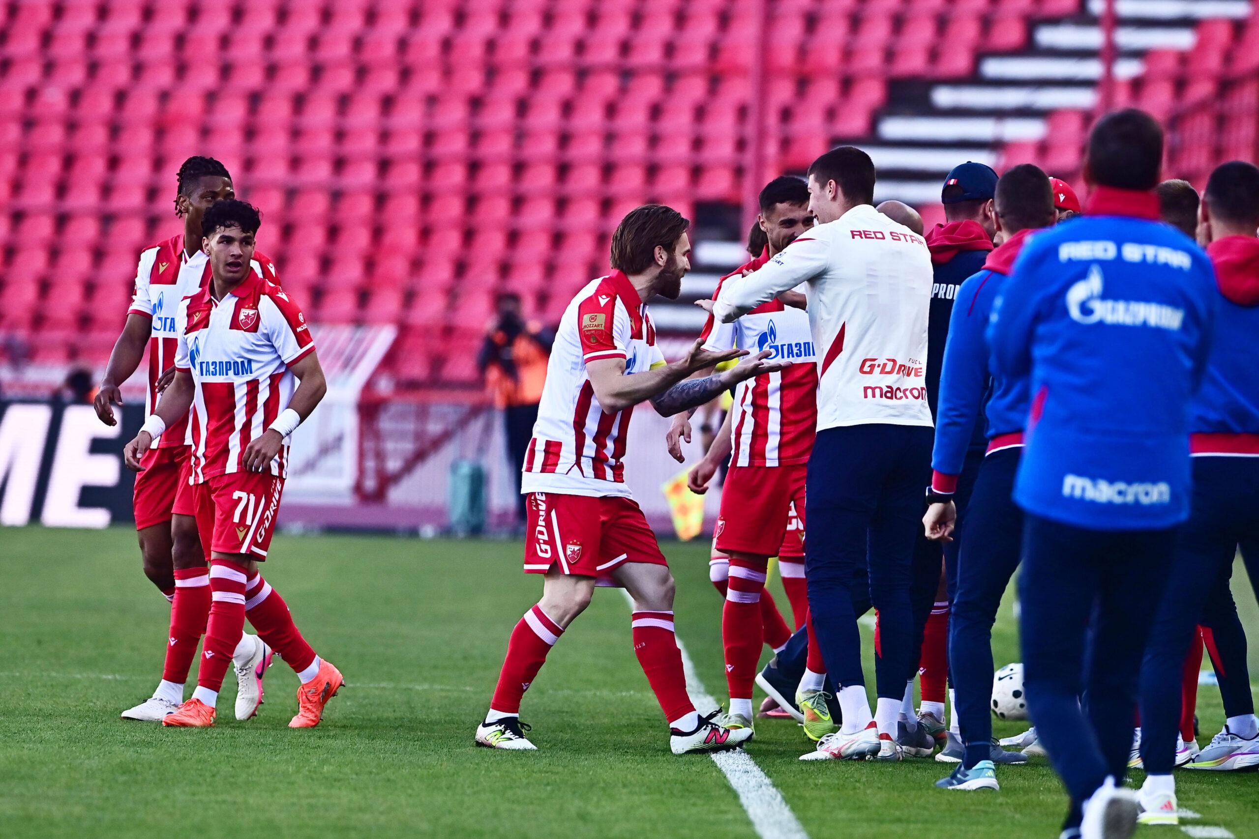 Atmosfera na stadionu je na vrhuncu, a navijači oba tima prate svaki potez svojih ljubimaca. Meč se nastavlja, a Crvena zvezda je trenutno u prednosti zahvaljujući golu Strahinje Erakovića i izuzetnoj asistenciji Aleksandra Kataija.