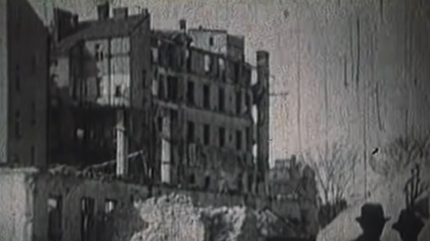 Snimak prikazuje posledice napada nemačke avijacije u kojem su uništene brojne zgrade i kulturne ustanove